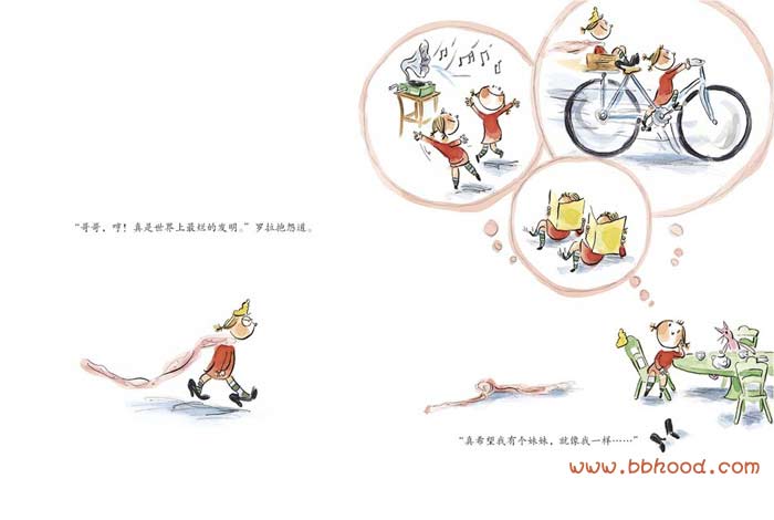 罗拉的“糟糕”三胞胎哥哥们又像往常一样在家玩海盗的游戏,罗拉期待地问他们:“我可以一起玩儿吗?”结果三个哥哥对她大吼:“走开!嗷——”,罗拉很伤心很失望地走了,她边走边想:真希望有个妹妹,这样就有人陪我一起玩儿了。