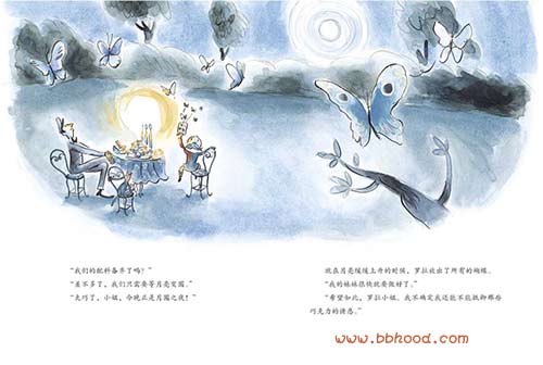 可是怎么样才能有个妹妹呢?她去问爸爸,爸爸告诉她:生个妹妹,得像做蛋糕一样需要很多配料,得有一个爸爸、一个妈妈、蝴蝶、圆月,烛光晚餐、亲亲和抱抱,还有巧克力。