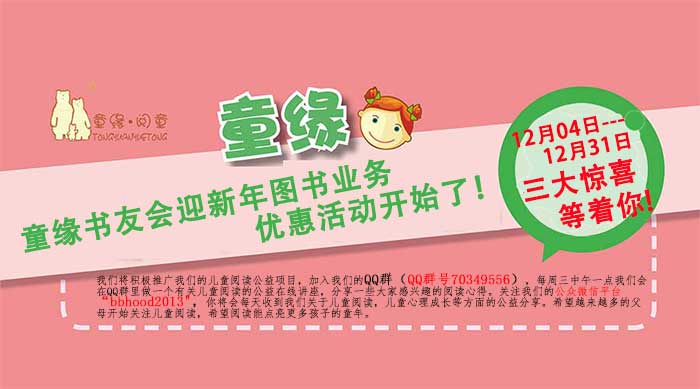 惊喜三:从即日起到2014年12月31日,非童缘用户,购买图书享受八五折优惠,消费金额满100元,即获得一次免费读书会活动,满100元即送一次,多买多送。